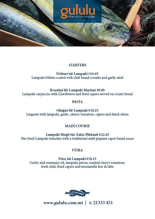 Lampuki is Malta’s fish, our fish. Since time immemorial this beautiful fish, blue and gold, has kept its appointment and swum in large shoals past our islands providing fresh fish on the tables of all, rich and poor alike.